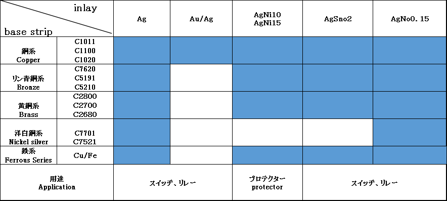 リレー、スイッチ、プロテクター用クラッド材●製造組合表(図表の着色は製造可能品種で、他のクラッドの対応も行っておりますのでお気軽にお問い合わせください。)